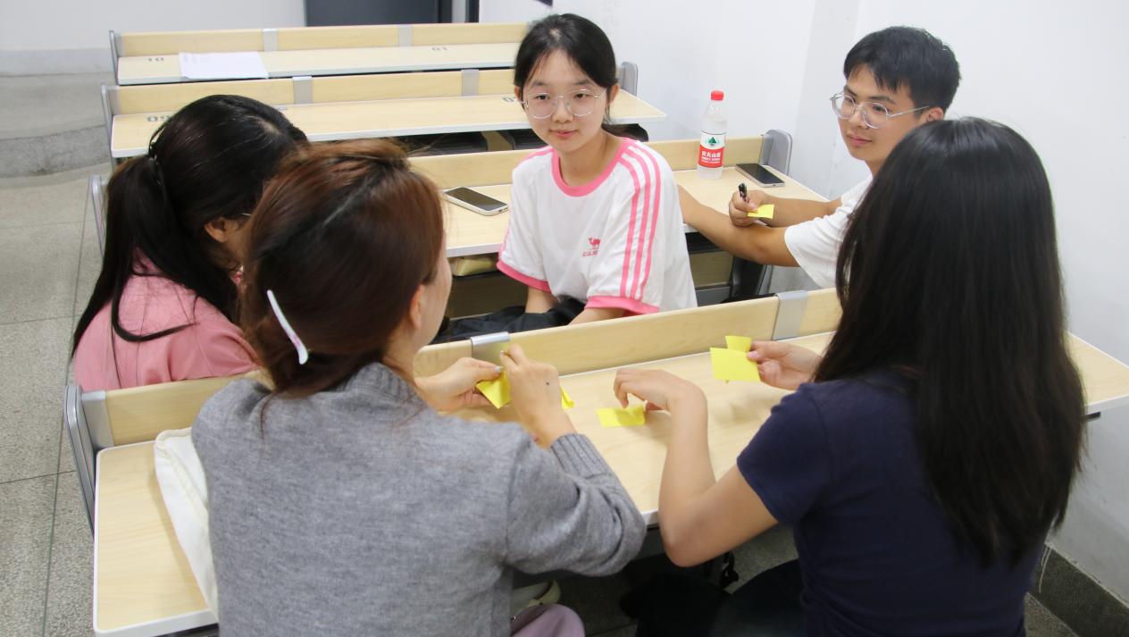 培训在活力四射的“便利贴保卫战”中激情开场,心理委员迅速组成3个小组,在提前划定的区域内展开了一场别具一格的“战斗”——既要全力保护己方的便利贴,又要巧妙撕下对方的便利贴。各小组在接到任务后迅速制定分工策略,有的成员化身为坚实的“防守卫士”,有的成员则主动出击如灵动的“猎手”,在激烈对抗且避免肢体冲突的过程中展现出良好的团队协作素养。5分钟的趣味对抗后剩余便利贴最多的小组获胜,大家在欢声笑语中初步体会到团队配合的强大力量,为后续环节的深入开展奠定了坚实基础。
