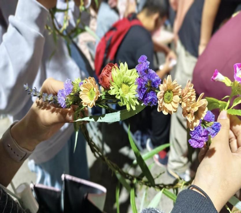 作品完成后,“作品展示区”成为广场上最热闹的角落。师生们带着亲手制作的花环拍照分享,协会还贴心准备了丝带、珍珠等装饰材料,供大家进一步美化作品。不少同学表示,从整理花材到完成花环的全过程,注意力高度集中,暂时忘却了学业与生活中的压力,这种动手创作的成就感让心情变得格外舒畅。