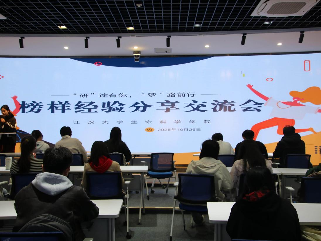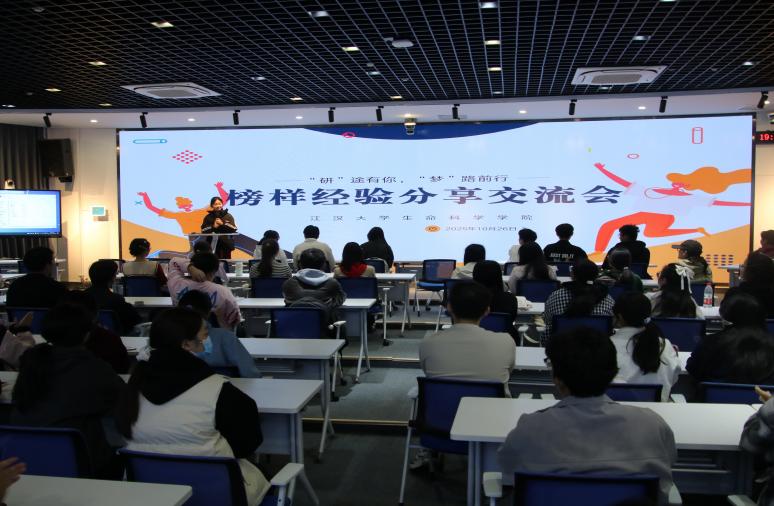 秋意渐浓,学思正酣。为帮助 2025 级大一新生快速适应大学学习节奏,找到适配自身的学习方法,科学统筹日常学业与个人能力培养,2025 年 10 月 26 日 19:10-20:00,江汉大学生命科学学院团委学生会学习部精心策划的 “‘研’途有你,‘梦’路同行” 榜样经验交流会在 J12A109 教室温情开讲。本次交流会特别邀请到学院两名成功保研的优秀学子潘研、陈章博,以及校标兵荣誉获得者王玉担任分享嘉宾,学院 2025 级 100 余名新生怀揣期待到场聆听,学习氛围浓厚。