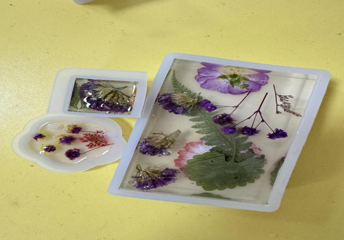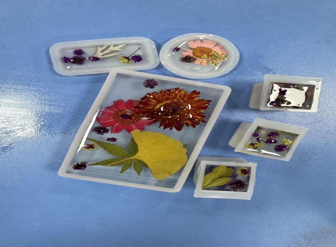 活动现场处处透露着心理关怀的温度,温馨的布置让同学们迅速卸下疲惫。课桌上,硅胶模具、干花标本与树脂材料包整齐排列,从调配树脂的细致操作,到精心挑选植物、设计摆放造型,参与者一步步沉浸于专注的创作氛围中。有人以银杏叶搭配小雏菊,借自然意象传递坚韧与希望的心境;有人用紫菀花与蕨类枝叶构建层次,寄托对内心平和的追求。在此过程中,师生们剥离日常喧嚣,回归手作的纯粹,每一个动作都成为一次正念练习,在专注当下中实现身心的初步疗愈。