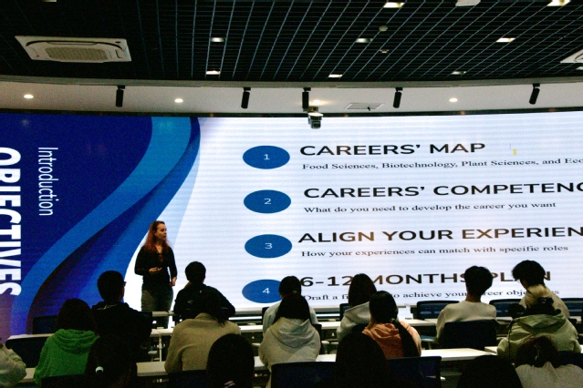 2025年11月12日在J12A109江汉大学生命科学学院特邀外籍教授萨拉・普拉托(Sara Platto)开展“生命科学职业道路”专题讲座。讲座围绕职业路径规划、核心能力培养、经历整合与短期目标设定四大核心模块,为大一新生带来了兼具专业性与实用性的职业发展指南,助力生命科学领域学子明确成长方向。