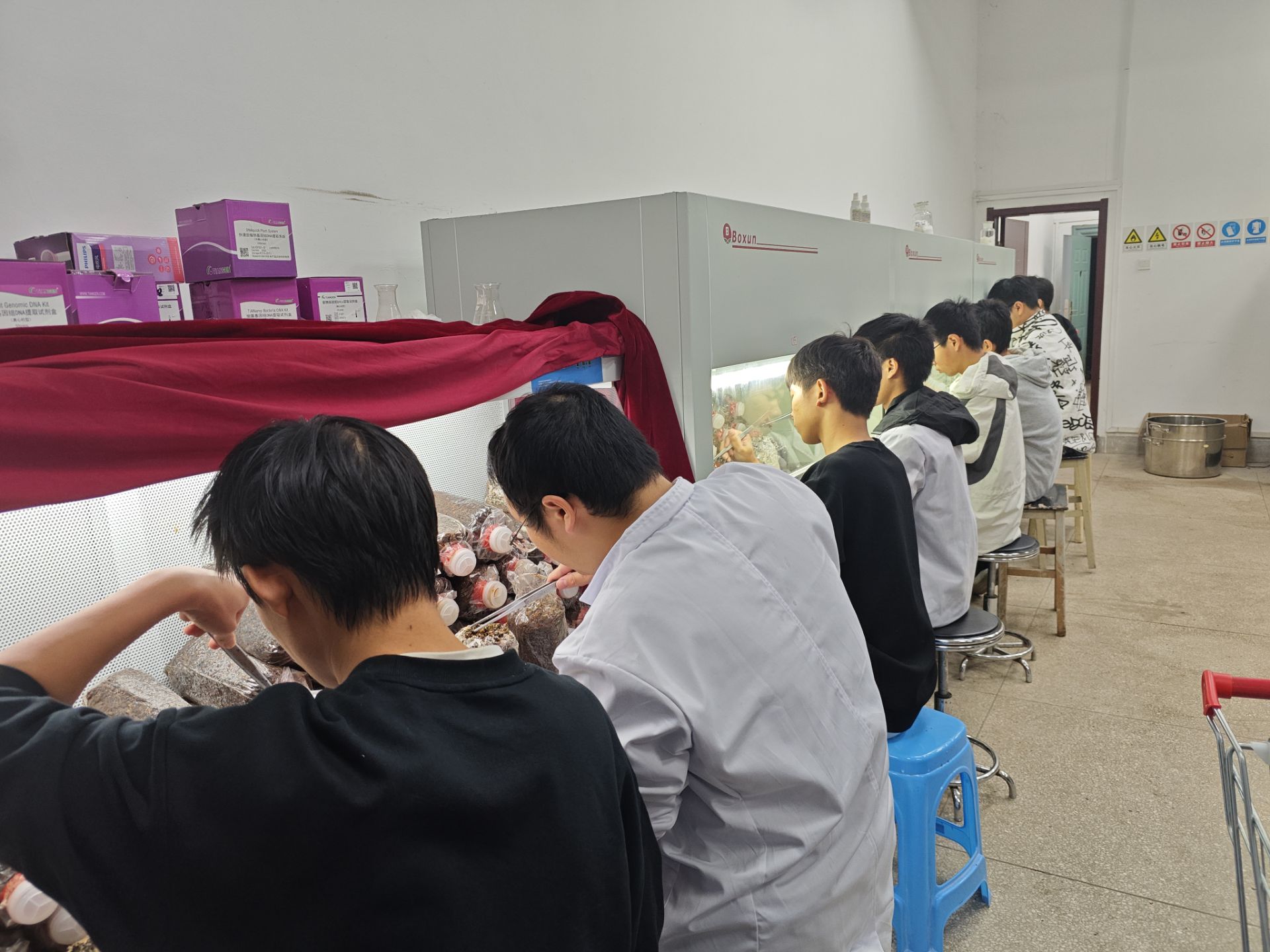 活动现场,专业教师与心理辅导员组成的指导团队全程护航,构建起“专业引领+心理疏导”的双重支持体系。在认知环节,教师结合专业知识,系统讲解蘑菇生长周期、培养基配比等核心内容,将微生物学原理与生命教育理念有机结合,让学生理解“顺应规律”既是科学准则也是成长智慧。体验环节中,同学们分组进行菌料搅拌、装袋压实、灭菌接种等操作,在分工协作中交流技巧,在精细操作中专注凝神,原本的学业压力在劳作中自然消解。“搅拌菌料时要掌握力度,就像调节情绪需要把握尺度,这个过程让我学会了沉下心来。”2024级生物技术专业学生李同学说。