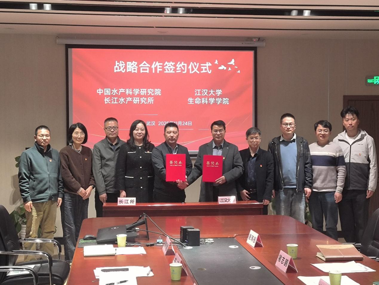 在与会人员的共同见证下,双方正式签署了《战略合作框架协议》。根据协议,江汉大学生命科学学院与中国水产科学研究院长江水产研究所将本着“优势互补、资源共享、互利共赢、共同发展”的原则,在科学研究与协同创新、人才培养与交流、平台与基地建设、资源共享等方面建立长期、稳定的战略合作关系。双方将共同致力于构建产学研用协同创新体系,聚焦水生生物资源保护、水域生态修复、水产种质资源等前沿领域开展联合攻关,并积极探索研究生联合培养、教学科研人员互访等人才共育新机制。