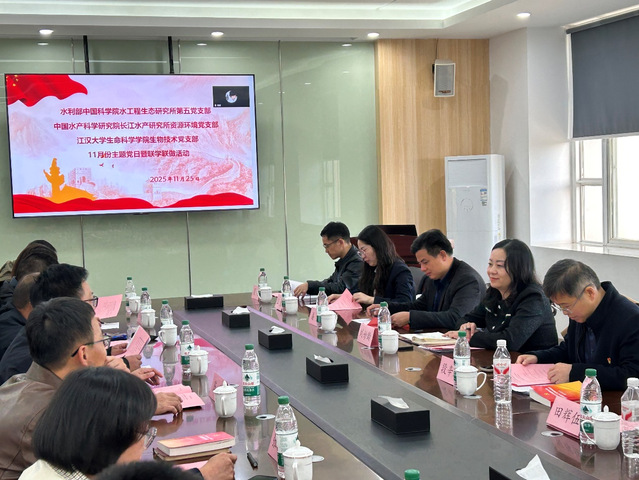 为深入学习贯彻党的二十届四中全会精神,积极探索党建引领业务深度融合的有效路径,2025年11月25日,水利部中国科学院水工程生态研究所第五党支部、中国水产科学研究院长江水产研究所资源环境党支部与江汉大学生命科学学院生物技术党支部,聚焦“党建引领,校所融合,促生物技术一流专业高质量发展”主题,在水利部中国科学院水工程生态研究所汉阳基地联合举办了一场内容丰富的支部共建活动。江汉大学生命科学学院党委书记刘妙龄、熊飞教授带领的水生态保护与修复创新团队、生物技术系系主任潘磊、生物技术系党支部书记王莹,以及部分党员代表共同参加了此次活动。