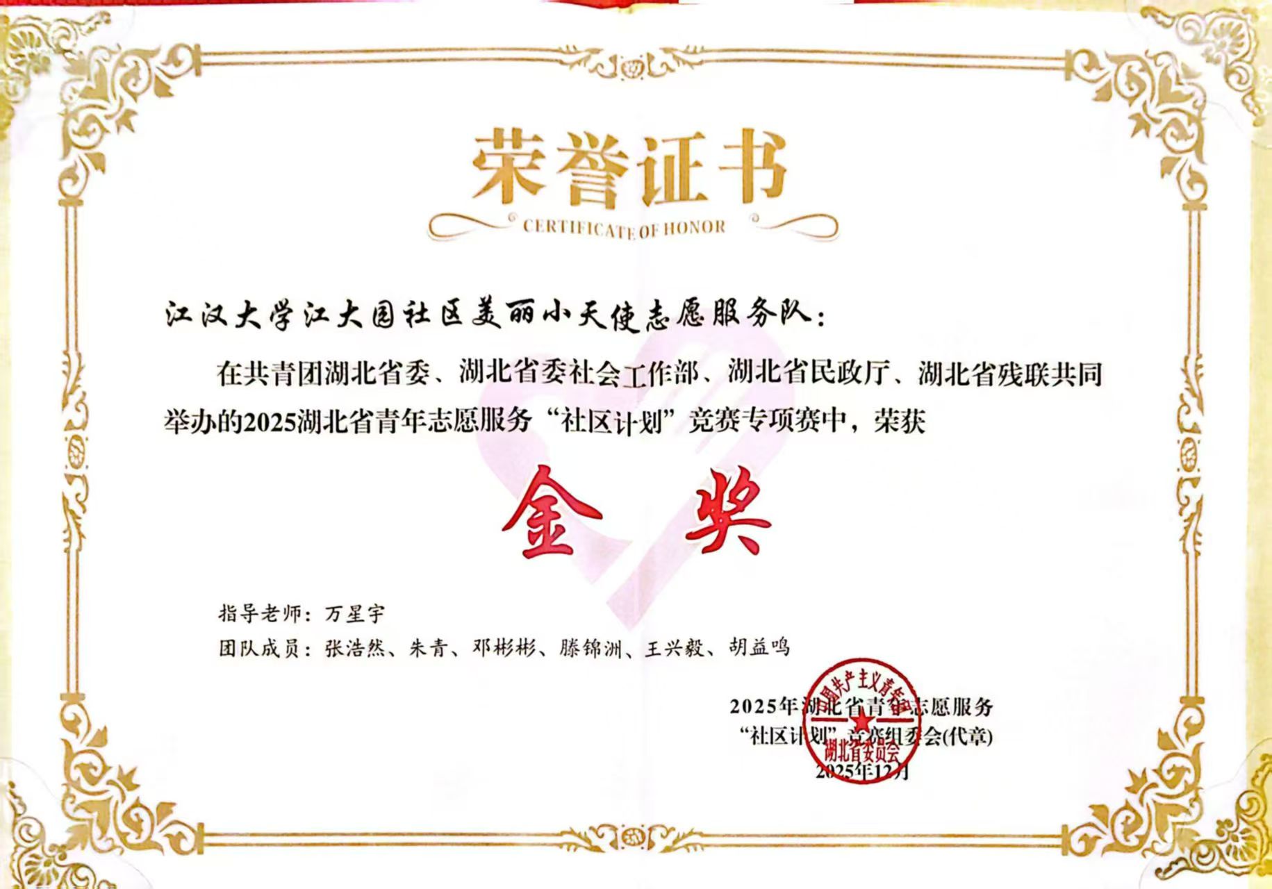12月7日,2025年湖北省青年志愿服务“社区计划”竞赛决赛暨社区青年志愿服务总结交流活动在湖北荆门圆满落幕。我校参赛团队在此次竞赛中表现优异,斩获金奖1项,充分展现了江大青年投身志愿服务、助力基层治理的青春风采。