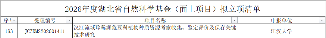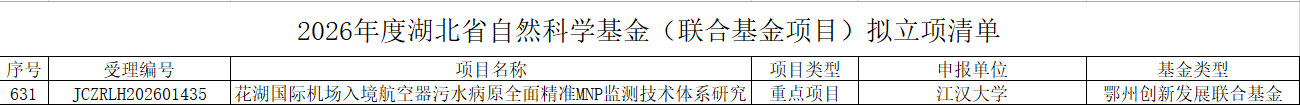 通讯员:郭瑞近日,2026年度湖北省自然科学基金拟立项项目已公示,我院获资助面上项目和联合基金重点项目各1项。其中,董翔博士聚焦汉江流域珍稀濒危豆科植物种质资源考察收集、鉴定评价及保存关键技术研究;高利芬老师与鄂州市联合申报,以“花湖国际机场入境航空器污水病原全面精准MNP监测技术体系研究”为题,旨在服务地方重大技术需求。责任编辑:吕方舟 审核人:曾长立