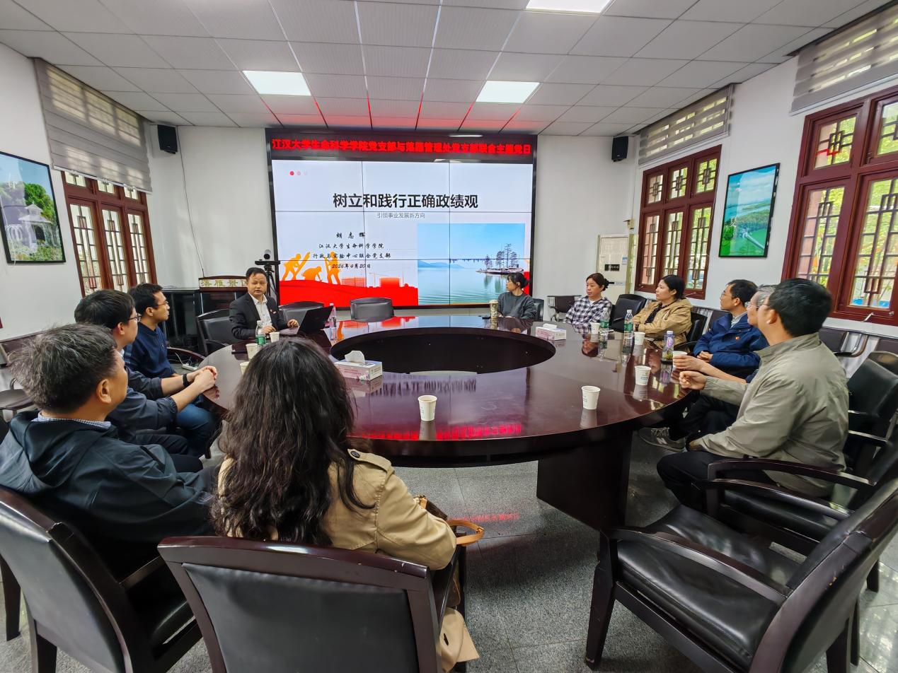 江汉大学生命科学学院行政与实验中心联合党支部书记胡志辉紧扣政绩观和生态保护主题讲授专题党课,树立和践行正确政绩观引领事业发展新方向,凝聚党建引领生态建设思想共识。